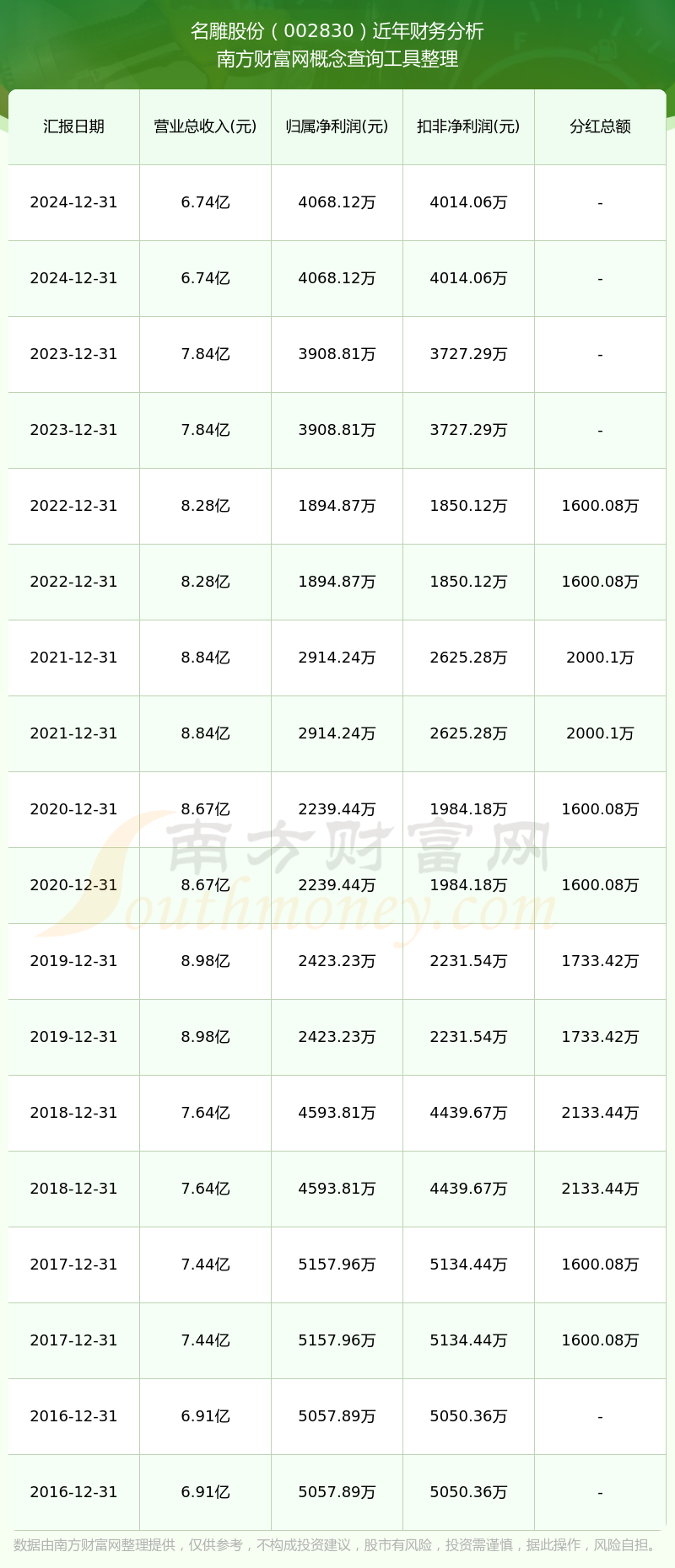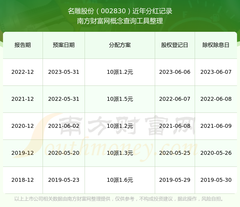 名雕股份最新一次公布的分紅方案為10派1.2元。本次權(quán)益分派股權(quán)登記日為2023年6月6日,除權(quán)除息日為2023年6月7日,派息日為2023年6月7日。