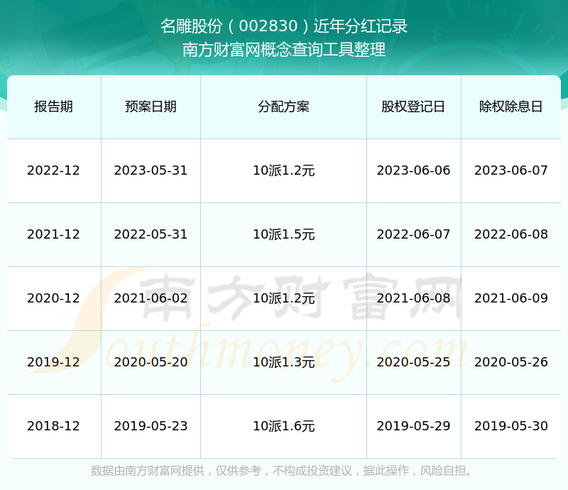 名雕股份最新一次公布的分紅方案:10派1.2元。