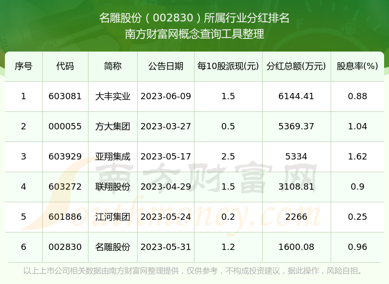 按照南方財(cái)富網(wǎng)趨勢選股系統(tǒng)統(tǒng)計(jì),名雕股份所屬行業(yè)為裝修裝飾行業(yè),裝修裝飾行業(yè)分紅排名情況如下表: