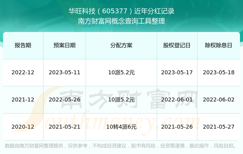 華旺科技最新一次公布的分紅方案為10派5.2元。本次權(quán)益分派股權(quán)登記日為2023年5月17日,除權(quán)除息日為2023年5月18日,派息日為2023年5月18日。