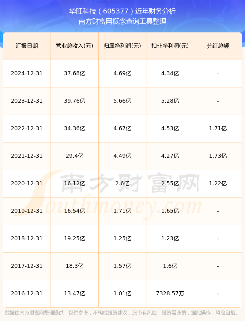 2024年華旺科技總營收37.68億,同比增長-5.21%;凈利潤4.69億,同比增長-17.18%;銷售毛利率15.76%。