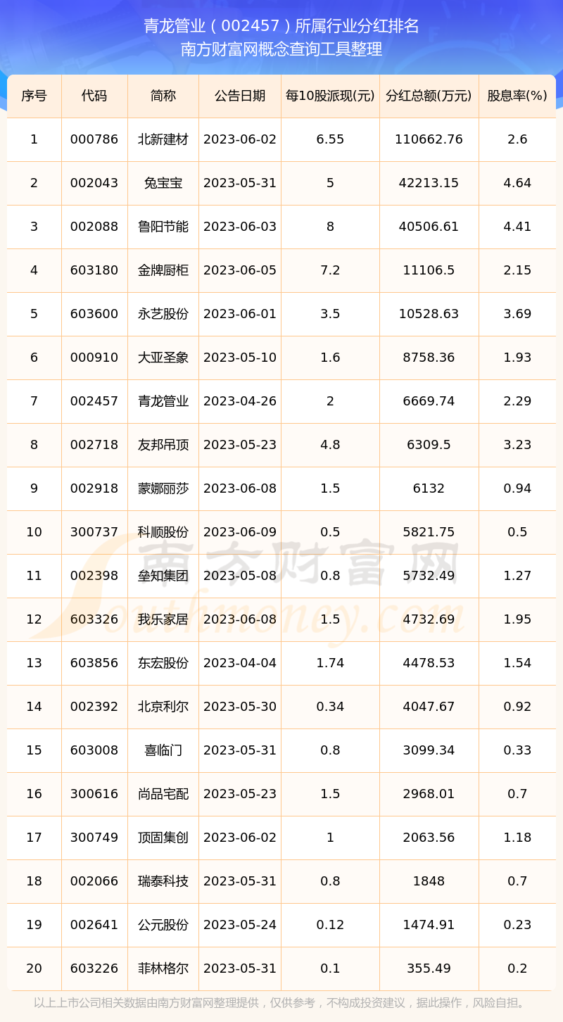 二、青龍管業(yè)002457行業(yè)分紅排名